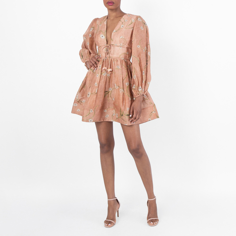 Zimmermann Ladies Dresses. Fashion category: Casual Dresses. SKU: 3761DS251. Color: Dancing Floral. Zimmermann Illuminate Drawn Mini Dress. This silk-linen mini dress features a plunging V-neckline and a self-tie bow detail at the center bust, accented with delicate flower trims. The design includes long blouson sleeves with elasticated cuffs, a gathered waistline, and piping detailing throughout. Finished with a full mini skirt, an invisible center back zip, and full lining for added comfort and structure. Material: 91% linen, 9% silk.