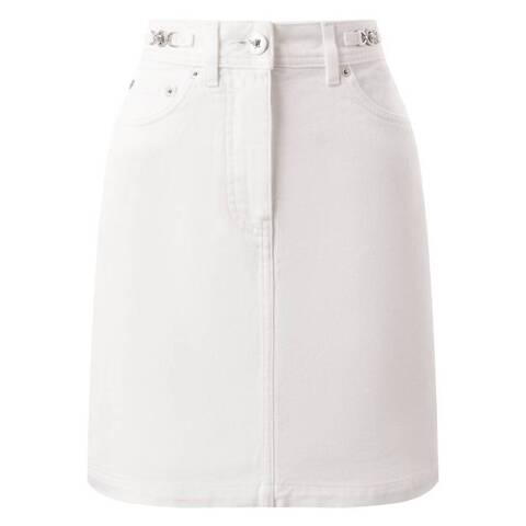 Versace Ladies Bottoms. Fashion category: Skirts. SKU: 1015059-1A13651. Color: White. Versace Cotton Denim A-Line Skirt. This denim skirt features a classic five-pocket design, and is adorned with Medusa '95 hardware. It includes belt loops, a front button and zip closure, and a Versace logo leather patch for a signature touch. 100% Cotton. Made in Italy.