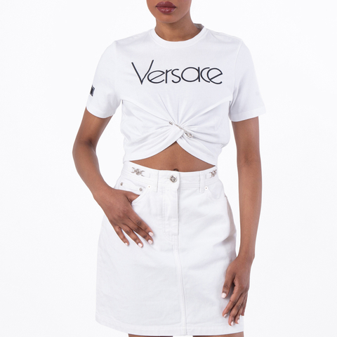 Versace Ladies Tops. Fashion category: T-Shirts & Henleys. SKU: 10113311A09120-2W020. Color: White/Black. Versace Safety Pin 1978 Logo T-Shirt. This cropped T-shirt features an embroidered Versace logo and a gathered hemline accented with iconic Safety Pin hardware. Designed with short sleeves and a classic crewneck, it offers a bold yet effortless statement look. 100% Cotton. Embroidery: 100% Polyester. Made in Portugal.