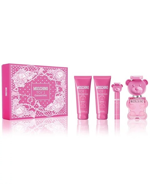 Launch year: 2021. Fragrance Family: Floral Fruity. Top notes: Candied fruits, Bitter orange, Lemon. Heart notes: Bubble gum, Bulgarian rose, Blueberry, Cinnamon, Peach, Ginger, Peach blossom. Base notes: Ambroxan, Musk, Cedar. Design house: Moschino. Design house category: fashion. Design house country: Italy. Scent name: Toy 2 Bubble Gum. Gender: Ladies. Category: Fragrance. SubType: Gift Set. Barcode: 8011003903337. Moschino Toy 2 Bubble Gum 3.4 Edt L + 3.4 B/L + 3.4 S/G + 10Ml. Moschino Ladies Toy 2 Bubble Gum Gift Set Fragrances 8011003903337. <br/><br/> This item is only valid for shipment in the Contiguous United States & Canada.