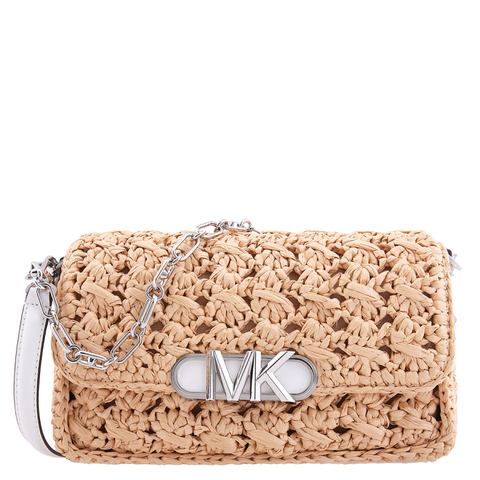 Michael Kors Ladies Shoulder Bag. Parker series. SKU: 30S3S7PC2W-884. Color: Natural. Michael Michael Kors Parker Medium Woven Raffia Shoulder Bag. A chic, beach-ready twist on the classic Parker shoulder bag, crafted from woven raffia and accented with an empire logo applique. This convertible design includes two interchangeable strapsa leather strap and a chain-link strapallowing for versatile styling options from shoulder to crossbody. Material: 100% Polypropylene (straw); Trim: 100% Leather. Lining: 100% Polyester. Dimensions: 10.75 6.25 4 in (27.3 15.9 10.2 cm). Handle Drop: 8.5 in (21.6 cm).