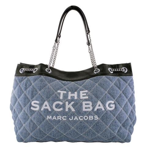 Marc Jacobs Ladies Tote. SKU: 2P5HSH033H03-416. Color: Light Wash Indigo. Marc Jacobs The Quilted Denim Chain Sack Bag. Large Chain Sack shoulder bag from Marc Jacobs, featuring a quilted denim design with an outline-stitched embroidered logo. Designed with two leather-and-chain straps, a magnetic closure, one main compartment, and an interior zip pocket. 100% Cotton.