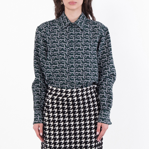 Burberry Ladies Tops. Fashion category: Shirts & Blouses. SKU: 8088949. Burberry B-Silk Green ShirtA long-sleeved silk poplin shirt printed with Burberrys signature b closure motif, inspired by the hardware of the Rocking Horse bag. Fit: Regular fit - true to size. Buttons: Mother-of-pearl.Care: Specialist dry clean. Material: 100% Silk.Made in Italy.
