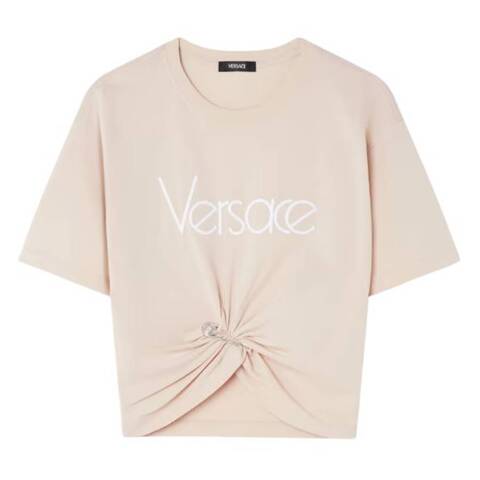 Versace Ladies Tops. Fashion category: T-Shirts & Henleys. SKU: 1018898-1A13610. Color: Champagne/White. Versace 1978 Re-Edition Logo Safety Pin T-Shirt. This T-shirt features a 1978 Re-Edition Logo embroidered on the front and is gathered at the waist with the signature Safety Pin hardware. Designed with a classic crewneck, short sleeves and a cropped design. 100% Cotton. Made in Portugal.