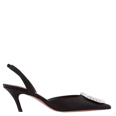 Amina Muaddi Ladies Heels. SKU: CAMELIA SLING 60-SATIN BLACK. Color: Satin Black. Amina Muaddi Camelia 60 Satin Slingback Pumps. The Camelia slingback pumps from Amina Muaddi are crafted from satin for a striking, luminous finish. Featuring a pointed toe, crystal-embellished buckle, and 60mm stiletto heel, they combine elegance with signature glamour. Finished with leather lining. Made in Italy. <br/><br/><b>Please visit the brand website for sizing information.</b>