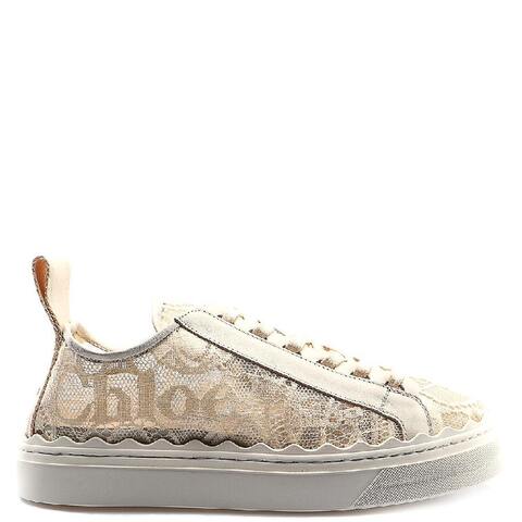 Chloe Ladies Sneakers. SKU: CHC19U108D26J136W. Color: Mild Beige. Chloe Lauren Lace-Up Scalloped Trims Sneakers. These Lauren lace-up sneakers are made from soft lace and mesh for a transparent look. They feature tonal laces, a flexible white rubber sole, and a nylon back loop with the brand's logo. The signature scalloped design and round toe add a feminine touch to the sporty style. Upper: cotton, calfskin & polyamide; Sole: rubber; Lining: polyamide. <br/><br/><b>Please visit the brand website for sizing information.</b>
