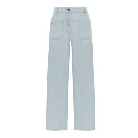 Victoria Beckham Ladies Bottoms. Fashion category: Jeans & Denim. SKU: 1225DJE005218O-LIGHT AZUL. Color: Light Azul. Victoria Beckham Alina Cotton Denim Jeans. The Alina jeans feature a high-rise waist and a wide, flared leg cut from non-stretch, mid-weight denim. Designed with both front and back patch pockets, theyre finished with a front zip fly, branded shank button, a contrast red buttonhole, and signature red VB embroidery on the right front pocket. 100% Cotton. Made in Italy.