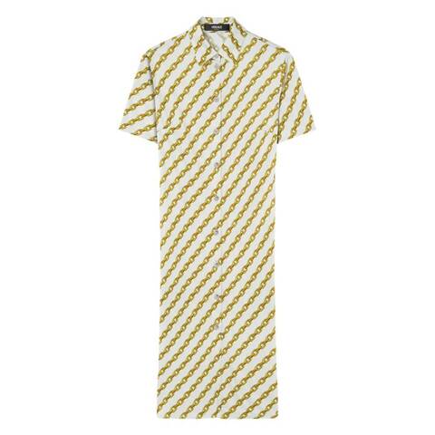 Versace Ladies Dresses. Fashion category: Casual Dresses. SKU: 1018503-1A13547. Color: Bone/Gold. Versace Chain Stripes Midi Shirt Dress. This midi shirt dress is crafted from fluid jersey and features an oblique golden chain pattern. Designed with a pointed flat collar, front button fastening, and short sleeves, it is finished with signature Medusa Head buttons. Made in Italy.