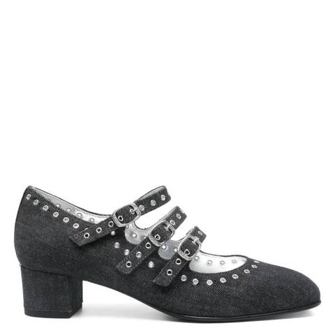 Carel Ladies Heels. SKU: 332801. Color: Tissu Jeans Noir. Carel Camden Denim Buckled Pumps. These Mary Janes have been reimagined through the lens of English fashion, drawing inspiration from the punk movement of the 1970s. Decorated with genuine perforated metal eyelets, they exude a bold, rebellious edge. Crafted with a denim fabric upper, they feature a buckle-fastening, a low block heel for comfort, and are finished with a leather lining and leather sole for a refined touch. Outer: 100% Fabric. Made in Italy. <br/><br/><b>Please visit the brand website for sizing information.</b>