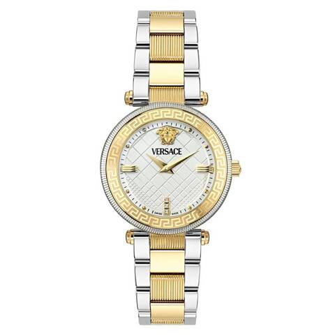 Silver-tone stainless steel case with a two-tone (silver-tone and gold-tone) stainless steel bracelet. Fixed silver-tone stainless steel bezel. White dial with gold-tone hands and index hour markers. Minute markers around the outer rim. Dial Type: Analog. Quartz movement. Scratch resistant sapphire crystal. Pull / push crown. Solid case back. Round case shape, case size: 35 mm. Deployment with push button release clasp. Water resistant at 50 meters / 165 feet. Functions: hour, minute. Reve Series. Dress watch style. Watch label: Swiss Movt. Versace Reve Quartz White Dial Ladies Watch VE8B00724.