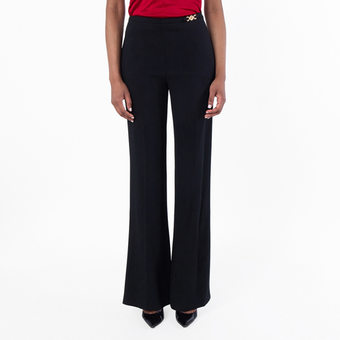 Versace Ladies Bottoms. Fashion category: Pants & Leggings. SKU: 1017686-1A13635-BLACK. Color: Black. Versace Cady Wide-Leg Pants. These wide-leg pants are crafted from stretch double-cady fabric, offering a structured yet comfortable fit. They feature Medusa '95 hardware at the waist for a signature touch, along with side slit pockets and a discreet side zip closure for a clean, polished finish. 50% Viscose, 47% Acetate, 3% Elastane.