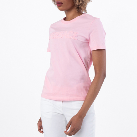 Versace Ladies Tops. Fashion category: T-Shirts & Henleys. SKU: 1018981-1A13616-95 PASTEL PINK. Color: Pastel Pink. Versace Logo-Applique Crewneck T-Shirt. Elevate your casual wardrobe with this Versace crewneck T-shirt, crafted from premium cotton for ultimate comfort and durability. Featuring short sleeves, the design is punctuated by an intricately embroidered logo on the front, showcasing the brands signature attention to detail and luxury aesthetic. Material: 100% cotton. Made in Portugal.