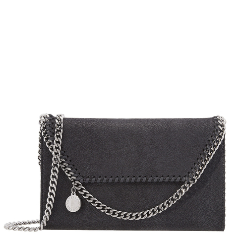 Stella McCartney Ladies Shoulder Bag. Falabella series. SKU: 581238W91321000. Color: Black. Size: 8.6 x 5.5 x 1in. Stella McCartney Falabella Mini Crossbody Bag. Falabella wallet crossbody bag crafted from the brands matte Shaggy Deer fabric, a semi-gloss, cruelty-free alternative to leather. Designed in an envelope wallet shape, it features the iconic diamond-cut Falabella chain that extends into a crossbody strap. Finished with waxed GOTS-certified organic cotton lacing, one main compartment, one internal slip pocket, magnetic snap closure, and a ruthenium-engraved logo medallion charm. Main fabric: 55% polyester, 45% GRS-certified Newlife post-consumer recycled polyester, Trims: 70% solventless polyurethane, 30% post-consumer recycled polyester. Made in Italy.
