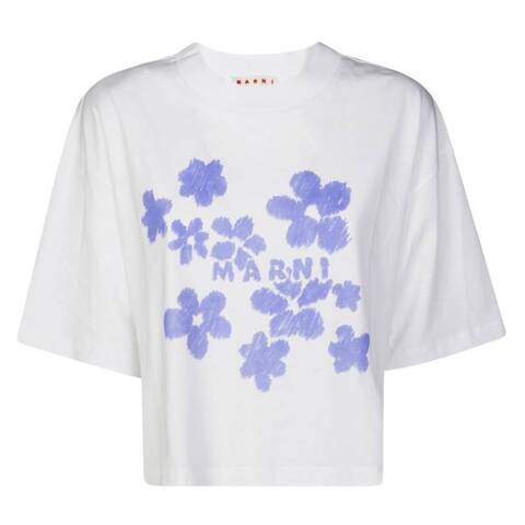 Marni Ladies Tops. Fashion category: T-Shirts & Henleys. SKU: THJE0333P4. Color: Lily White. Marni Daisy Garden Print Cotton T-Shirt. This boxy crew-neck T-shirt is crafted from white cotton and features short sleeves for a relaxed fit. The front is adorned with the seasonal Daisy Garden print and a subtle Marni logo, combining playful floral motifs with signature branding. 100% Cotton. Made in Portugal.