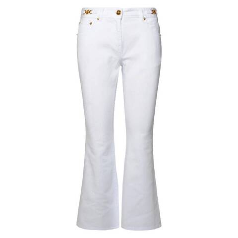 Versace Ladies Bottoms. Fashion category: Jeans & Denim. SKU: 1014103_1A08570. Color: White. Versace White Cropped Flared Jeans Flared, non-stretch denim jeans featuring a zip-fly, belt loops, and classic five-pocket styling. Finished with a leather logo patch at the back waistband and logo-engraved gold-tone hardware. Composition: Body: 100% Cotton; Trim: 100% Calf Leather; Lining: 65% Polyester, 35% Cotton. Made in Italy.