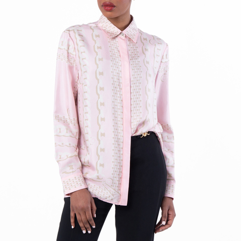 Versace Ladies Tops. Fashion category: Casual Button-Downs. SKU: 1001360-1A13638-95PASTEL PINK+MILK. Color: 95Pastel Pink/Milk. Versace Classic Treasure Silk Shirt. This timeless long-sleeved shirt is crafted from luxurious silk twill and showcases the Versace Treasure print, featuring chain motifs inspired by the Versace Kleio bag. Finished with a pointed collar, buttoned cuffs, a concealed front button placket, and an accent Medusa button for a signature touch. 100% Silk.