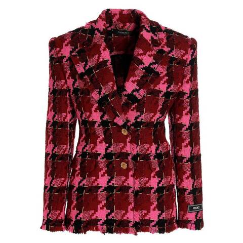 Versace Ladies Outerwear. Fashion category: Blazers. SKU: 1007401-1A05310-2R660. Color: Parade Red/Fuchsia. Versace Medusa Tweed Check Blazer. This single-breasted Versace jacket is tailored with notched lapels and padded shoulders, creating a structured silhouette. It features long sleeves, waist flap pockets, and front button closures, while a fringed hem adds a bold, modern finish. Outer: 62% virgin wool, 29% viscose, 5% polyamide, 4% cotton. Made in Italy.