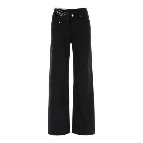 Alexander Wang Ladies Bottoms. Fashion category: Jeans & Denim. SKU: 4DC1254613-WASHED BLACK. Color: Washed Black. Alexander Wang Lace Detail Wide Leg Denim Jeans. These jeans feature a striking asymmetrical design with laced underwear detailing, complemented by a front button fastening and a zip fly with button closure. The design is further refined with two side insert pockets, two rear patch pockets, and belt loops, all finished with a classic straight leg for a sophisticated yet contemporary silhouette. 100% Cotton.