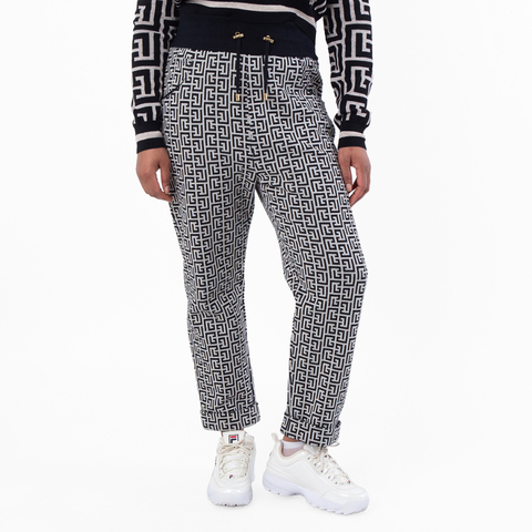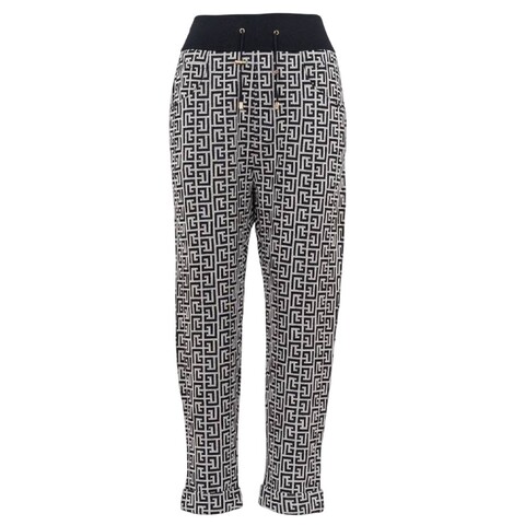 Balmain Ladies Bottoms. Fashion category: Active & Lounge. SKU: WF1OB000J193-GFE. Color: Ivoire/Black. Balmain Monogram Pattern Cotton Trousers. This trouser feature an all-over monogram print, with an archival logo inspired by Pierre Balmain's initials, a straight fit, and a wide elastic waistband for a comfortable fit. 100% Cotton. Made in Italy.