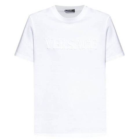 Versace Ladies Tops. Fashion category: T-Shirts & Henleys. SKU: 1018981-1A13616-1W000. Color: Optical White. Versace Logo-Applique Crewneck T-Shirt. Elevate your casual wardrobe with this Versace crewneck T-shirt, crafted from premium cotton for ultimate comfort and durability. Featuring short sleeves and a clean white base, the design is punctuated by an intricately embroidered logo on the front, showcasing the brands signature attention to detail and luxury aesthetic. Material: 100% cotton.