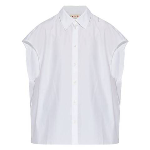 Marni Ladies Tops. Fashion category: Casual Button-Downs. SKU: CAMA0565S1. Color: Lily White. Marni Sleeveless Poplin Shirt. This Marni shirt is designed with an oversized silhouette and cap sleeves, crafted from lightweight cotton poplin for an airy feel. It features a chic spread collar, an embroidered updated logo at the front shoulder, a shirttail hem, and relaxed dropped shoulders. 100% Cotton.