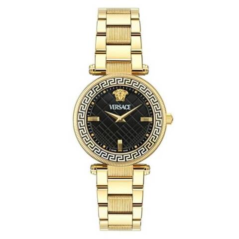 Gold-tone stainless steel case and bracelet. Fixed gold-tone stainless steel bezel. Black dial with gold-tone hands and index hour markers. Minute markers around the outer rim. Dial Type: Analog. Quartz movement. Scratch resistant sapphire crystal. Pull / push crown. Solid case back. Round case shape, case size: 35 mm. Deployment with push button release clasp. Water resistant at 50 meters / 165 feet. Functions: hour, minute. Reve Series. Dress watch style. Watch label: Swiss Movt. Versace Reve Quartz Black Dial Ladies Watch VE8B00624.