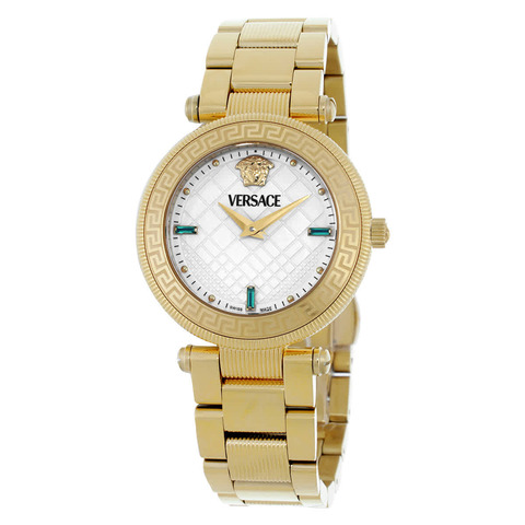 Gold-tone stainless steel case and bracelet. Fixed gold-tone stainless steel bezel. White dial with gold-tone hands and index hour markers. Minute markers around the outer rim. Dial Type: Analog. Quartz movement. Scratch resistant sapphire crystal. Pull / push crown. Solid case back. Round case shape, case size: 35 mm. Deployment with push button release clasp. Water resistant at 50 meters / 165 feet. Functions: hour, minute. Reve Series. Dress watch style. Watch label: Swiss Movt. Versace Reve Quartz White Dial Ladies Watch VE8B00824.
