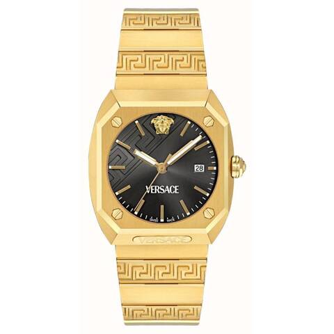 Gold-tone stainless steel PVD case and bracelet. Fixed gold-tone stainless steel bezel. Black dial with gold-tone hands and index hour markers. Minute markers around the outer rim. Dial Type: Analog. Date display at the 3 o'clock position. Versace Calibre Ronda 715 quartz movement. Scratch resistant sapphire crystal. Pull / push crown. Solid case back. Square case shape, case size: 41.5. Fold over clasp with a safety release. Water resistant at 50 meters / 165 feet. Functions: date, hour, minute, second. Antares Series. Dress watch style. Watch label: Swiss Made. Versace Antares Quartz Black Dial Ladies Watch VE8F00424.