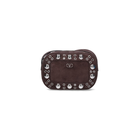 Valentino Ladies Shoulder Bag. SKU: WB0R74JET0TO. Color: Brown. Valentino Garavani Nellcote Shoulder Bag. Valentino Garavani nellcote shoulder bag in brown calf suede with silver metal studs pattern, adjustable shoulder strap, zip closure, silver metal VLogo Signature logo on the front, two interior card slots, and a single interior compartment. Composition: 100% Calf Leather.