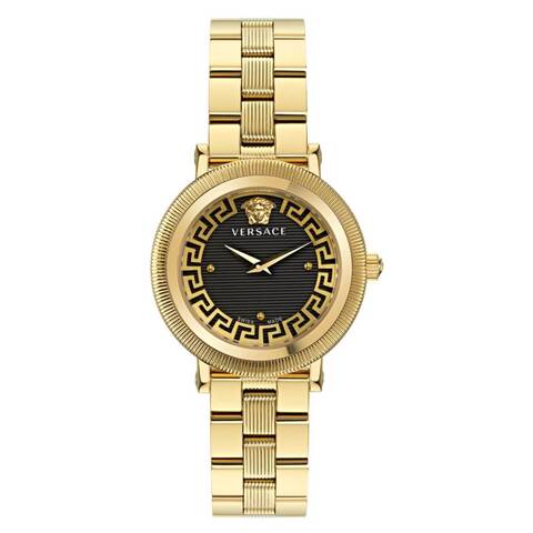 Gold-tone stainless steel case and bracelet. Fixed gold-tone stainless steel bezel. Black guilloche dial with gold-tone hands and index hour markers. Medusa at the 12 o'clock position. Dial Type: Analog. Quartz movement. Scratch resistant sapphire crystal. Pull / push crown. Solid case back. Round case shape, case size: 35 mm, case thickness: 8 mm. Band width: 16 mm. Deployment with push button release clasp. Water resistant at 50 meters / 165 feet. Functions: hour, minute. Greca Flourish Series. Dress watch style. Watch label: Swiss Made. Versace Greca Flourish Quartz Black Dial Ladies Watch VE7F00623.