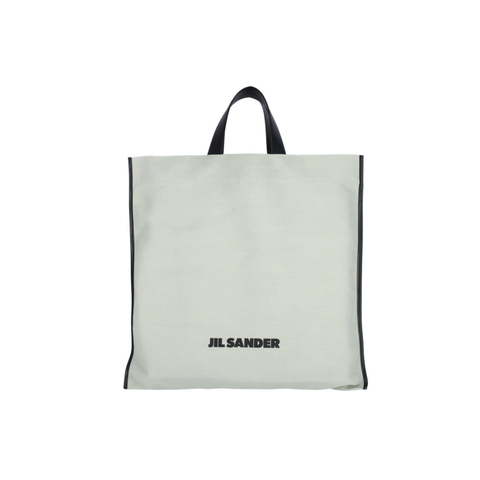 Jil Sander Ladies Tote. SKU: J07WD0105 P7328449. Color: Green. Jil Sander Square Tote Bag. Jil Sander 'Square' tote bag in white fabric, two top leather handles, contrast leather trim, front logo, single inner compartment. Composition: 61% Jute, 39% Cotton.