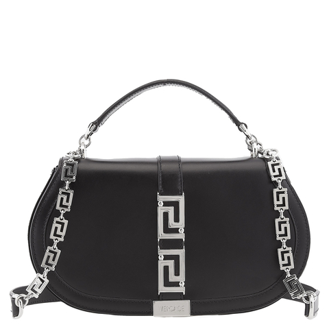 Versace Ladies Shoulder Bag. SKU: 10111781A051341B00P. Color: Black. Size: W: 10.2 x H: 5.5 x D: 2.8. Versace Greca Goddess Smooth Leather Shoulder Bag. The Greca Goddess bag provides versatile styling options with its detachable Greca chain and adjustable leather strap. Adorned with stylish silver-tone hardware, this bag features a structured silhouette crafted from luxurious calf leather. Its convenient snap button closure and two interior slip pockets.