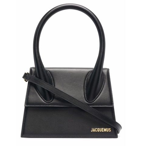 Brand: Jacquemus. SKU: 213BA0033000990. Color: Black. Jacquemus Ladies Le Grand Chiquito Tote Bag. Crafted from leather. This black Le Grand Chiquito tote bag from JACQUEMUS features a single rounded top handle, gold-tone logo lettering, tonal stitching, adjustable detachable shoulder strap, foldover top with magnetic fastening, internal logo patch and internal slip pocket. Dimensions: W 9.4 x H 6.7 x D 3.5. Made in Italy.