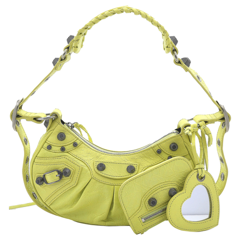 Balenciaga Ladies Shoulder Bag. SKU: 6713091VG9Y7302. Color: Yellow. Size: L: 10.2 x H: 6.3 x W: 2.7. Balenciaga Yellow Le Cagole XS Shoulder Bag. Arena lambskin. Leather braided shoulder pad. Zipped closure with knotted leather puller. Aged-silver hardware. 1 removable zipped pouch. 1 removable heart mirror. Tone-on-tone Balenciaga logo embossed on mirror. Cotton canvas lining. Made in Italy.