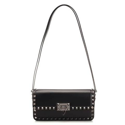 Valentino Ladies Shoulder Bag. SKU: 3W0B0M77QYV 0NO. Barcode: 8052962336859. Size: W 9 x H 4.7 x D 1.9. Valentino Garavani Rockstud Foldover Top Shoulder Bag. This elegant bag, crafted from smooth-grain calf leather with a matte finish, features signature Rockstud embellishments and a logo stamp on the rear. Its rectangular body is complemented by an adjustable shoulder strap and a front flap closure with a flip-lock fastening. The bag includes a slip pocket on the front, polished gunmetal-tone hardware, a main compartment with an internal slip pocket, and an internal logo stamp, all lined in leather. 100% Leather. Made in Italy.