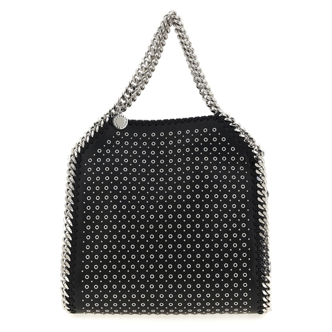 Stella McCartney Ladies Tote. SKU: 371223WP05821000. Color: Black. Stella Mccartney Mini Falabella Handbag. Mini Falabella' handbag in leather-effect fabric with all-over stud applique, diamond-effect chain, double fixed handle, magnetic closure, chain shoulder strap, medallion charm with engraved logo. SUSTAINABLE: Products that do not use leather respecting cruelty free ethics. Composition: 100% polyester.