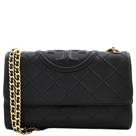Tory Burch Ladies Shoulder Bag. SKU: 137301-001. Size: W 10.6 x H 7.3 x D 3.9. Tory Burch Fleming Quilted Leather Shoulder Bag. Diamond-shaped quilting and Tory Burch's Double T logo embossed to the front. Featuring gold-tone hardware, quilted finish, logo patch to the front, foldover top with magnetic fastening, partitioned compartment, internal zip-fastening pocket, internal logo patch and a chain-link shoulder strap