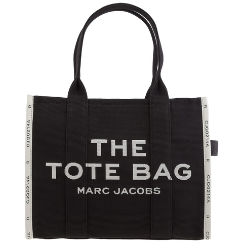 Marc Jacobs Ladies Tote. SKU: M0017048001. Color: Black. Size: 17in L x 6in D x 13in H. Marc Jacobs The Large Jacquard Tote Bag. The Large Tote is meticulously crafted from premium woven jacquard fabric, ensuring a luxurious feel. It boasts a convenient zip closure, along with a slip pocket and a card slot for added functionality. The tote is designed with a top handle and comes with a removable and adjustable webbing strap, providing versatility in carrying options. Outer: Cotton 64%, Polyester 36%.
