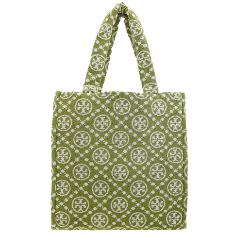 Tory Burch Ladies Tote. SKU: 148687-307. Color: Leaf Green. Tory Burch T Monogram Terry Tote Bag. Inspired by traditional Pennsylvania Dutch quilting, the T Monogram pattern embodies timeless style, while the new terry tote, crafted from thick, soft brushed cotton and woven on jacquard looms, offers an interior zip pocket and ample space for all of your daily essentials. 100% Cotton.