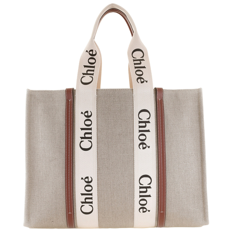 Chloe Ladies Tote. Woody series. SKU: CHC22AS382I2690U. Color: Wht-Brw. Size: W: 17.7 x H: 13 x D: 5.2. Chloe Large Woody Linen Tote Bag. This large Woody tote, crafted from lower-impact linen canvas with shiny calfskin strips, offers a spacious design with a summer-ready vibe, featuring a roomy compartment with a flat pocket, contrasting leather details, and the signature Chloe logo ribbon, all designed for comfortable shoulder carry. Main material: Linen.