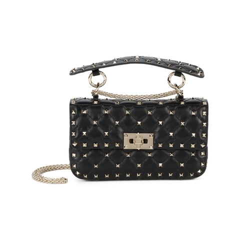 Valentino Ladies Shoulder Bag. SKU: WB0123NAP0NO. Color: Black. Valentino Garavani Small Shoulder Bag Rockstud Spike. Rockstud Spike Valentino Garavani small bag in soft quilted lamb nappa, rhombus theme outlined by tone on tone stitching, embellished and decorated with small platinum-colored studs. This bag can be carried either by hand with its removable handle, or over the shoulder thanks to the sliding and removable chain color of the studs. You can wear it both during the day with a sneakers and in the evening with an elegant heel. A true brand must, present in all collections with the color variant. An accessory that cannot be missing in a woman`s wardrobe!