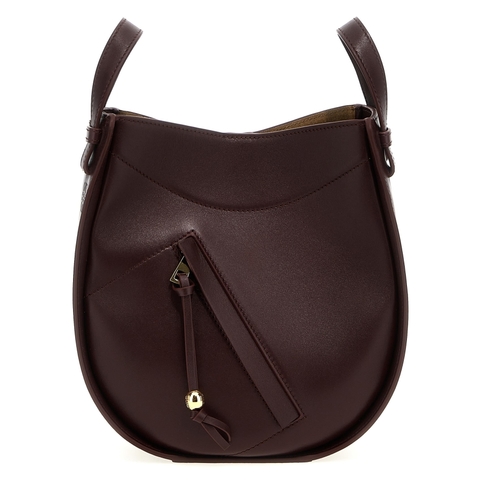 Loewe Ladies Crossbody. SKU: A538HHSX017240. Color: Bordeaux. Loewe hammock Slice Crossbody Bag. Hammock Slice' crossbody bag in shiny calf leather, side embossed logo, magnetic closure, heat-sealed suede lining, front pocket with zip closure and puller with 'Dado Anagram Pebble', adjustable and removable shoulder strap. Composition: 100% calfskin leather (Bos Taurus)