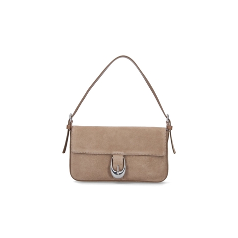 STAUD Ladies Shoulder Bag. SKU: H25P6003SDDUNE. Color: Beige. Staud Harlow Shoulder Bag. Staud 'Harlow' shoulder bag in beige calf suede with adjustable top handle, silver metal buckle closure on the front, logo detail engraved on the buckle, tone-on-tone engraved logo on the back, inner zip pocket, main inner compartment. Composition: 100% Calf Leather.