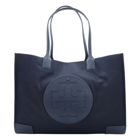 Tory Burch Ladies Tote. SKU: 87116-405. Color: Tory Navy. Size: Height: 13 (33cm) x length: 17.1 (43.5cm) x dept. Tory Burch Ladies Tory Navy Ella Tote Bag. Crafted from durable recycled nylon, this tote bag features hidden magnetic snap closure, naps on gussetssnaps on gussets, 1 hidden exterior pocket on logo patch, 1 interior front wall slit pocket, 1 interior back wall zipper pocket, faux leather trim, dual top handles with 9.1 (23cm) drop, and finished with a tonal double T logo adorning the front snap pocket.