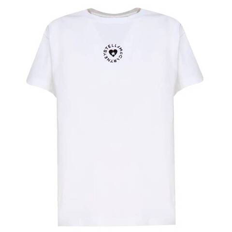 Stella Mccartney Ladies Tops. Fashion category: T-Shirts & Henleys. SKU: 6J02733SPY53-9000. Color: Pure White. Stella Mccartney Lovestruck Logo Cotton T-Shirt. This t-shirt is made from soft organic cotton jersey and features a classic crew neck with short sleeves. The chest is adorned with a playful black Stella star and heart motif alongside a black circular Stella McCartney logo. 100% organic cotton. Made in Portugal.
