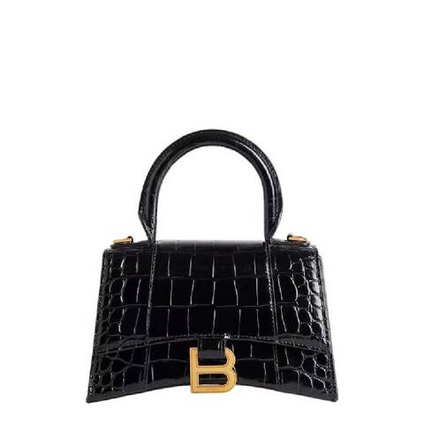 Balenciaga Ladies Handbag. Hourglass series. SKU: 5928331LRGM1000. Color: Black. Size: L 7.4 x H 5.1 x W 3.1. Balenciaga Shiny Crocodile Embossed Calfskin Handbag. This Handbag features one handle, an adjustable and removable crossbody strap, studded magnet closure, aged-gold B logo hardware, 1 back pocket and a curvilinear base. 100% Calfskin. Made in Italy.