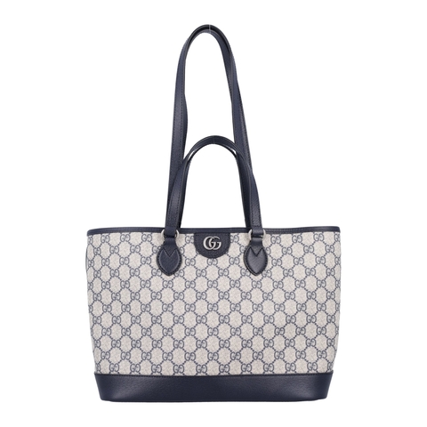 Gucci Ladies Tote. SKU: 765043K9GSN4075. Color: Beige Blue. Gucci Ophidia Medium Tote Bag. Ophidia Medium Tote Bag By Gucci. Featuring: Gg Supreme Canvas Leather Trim Top Handles Shoulder Straps Cotton Linen Lining Double G Silver-toned Hardware Height: 24 Cm Width: 31 Cm Depth: 13 Cm. Composition: 60% polyurethane, 20% cotton, 20% polyester Trim, 100% leather