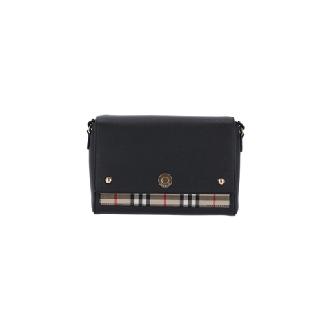 Burberry Ladies Crossbody. SKU: 8117037. Color: Black. Size: A 18 X L 25 X P 8. 5 CM. Burberry Note Crossbody Bag. Burberry Note shoulder bag in black fabric with all-over Check pattern, adjustable and removable shoulder strap, front button flap closure, gold metal hardware details, flat pocket, and single inner compartment. Composition: 100% Calf Leather