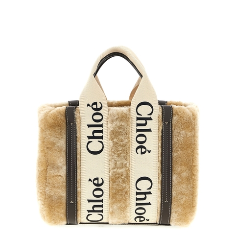 Chloe Ladies Tote. SKU: CH25WS397Q4424M. Color: Beige. Size: W 26. 5 x H 20 x D 8 cm. Chloe Woody Small Handbag. Small 'Woody' shearling handbag with contrasting leather details, double fixed handle in jacquard cotton canvas with oversize logo, adjustable and removable shoulder strap. Composition: 100% lamb leather (Ovis aries)