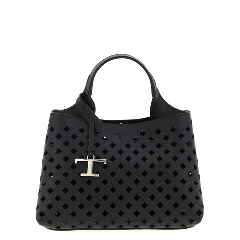 Tods Ladies Tote. SKU: XBWAPAEL0W0QRIB999. Color: Black. Size: 25 x H 17 x D 14.5 cm. TodS Apa Micro Handbag. Apa Micro' openwork leather handbag, removable pendant with metal T Timeless accessory, snap hook closure, adjustable and removable shoulder strap.. Composition: 100% calfskin leather (Bos Taurus)
